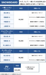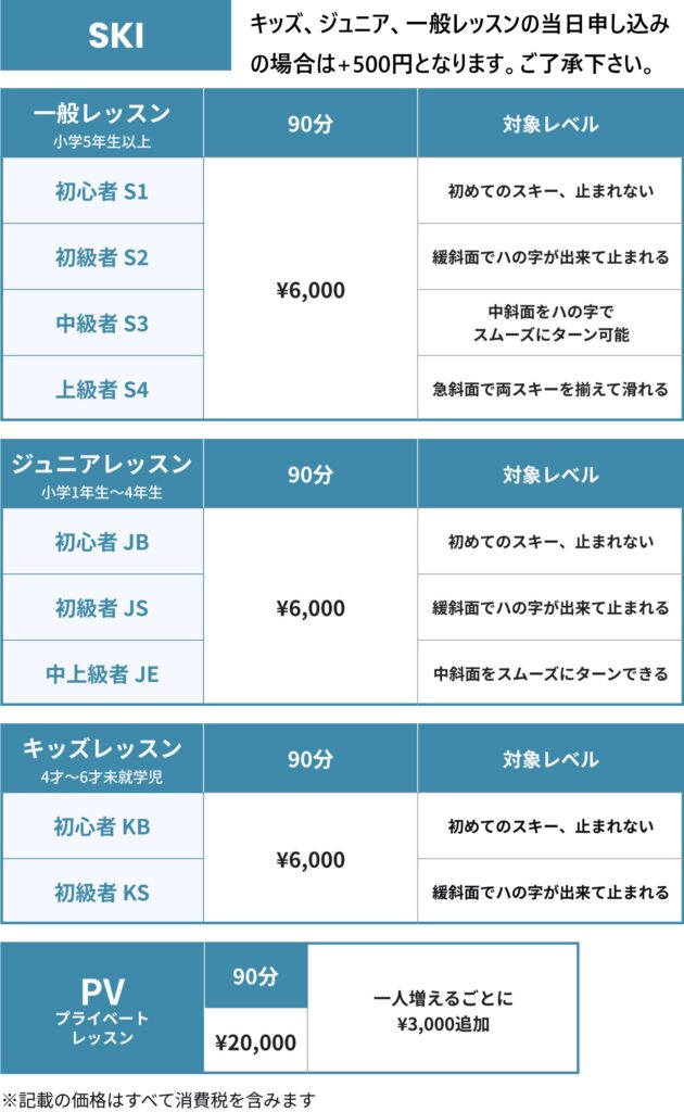 以下は、スクール料金のご案内です。 スクール受付時間 各レッスン開始30分前 受付場所 【土日祝】スクールハウス 8時30分open【平日】スクールハウス 8時30分open 講習時間 ①午前9時30分〜午前11時00分②午後12時00分〜 午後13時30分③午後14時00分〜午後15時30分 ※受付時間、集合時間に遅れますと、レッスンを受講していただけない場合があります。 WEB予約はこちら WEB予約はこちら