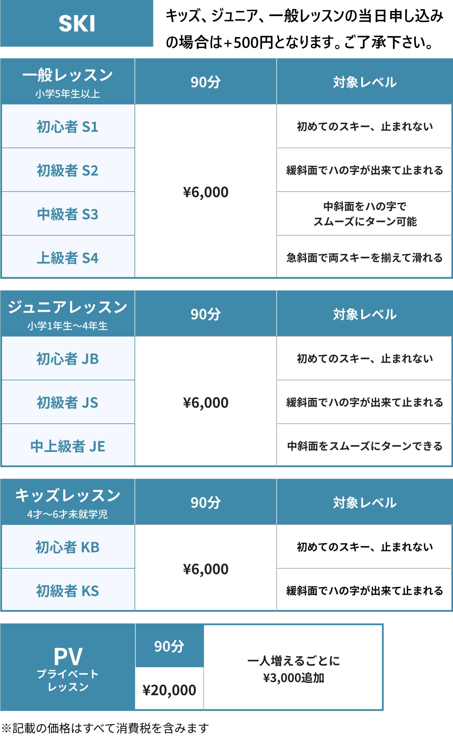なお当レッスン受講のお客様は、レッスン中数回リフト乗車行いますので事前にリフト1日券もしくは半日券をご購入下さい。